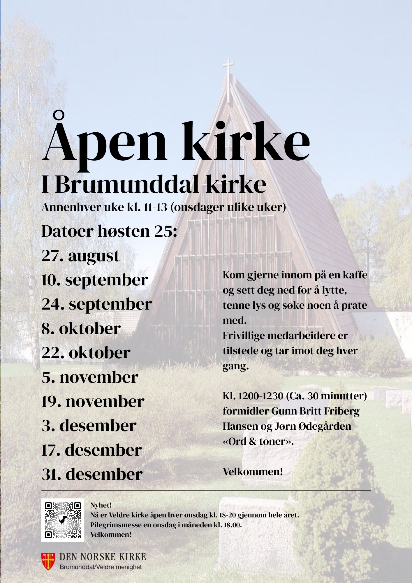 Veldre kirke, onsdager kl. 18.00-20.00 (hver uke)